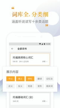 这款软件涵盖了托福基础词汇、学科话题词汇和校园场景词汇,每个词汇都配有配套练习和英美音双音频包。你可以通过听、说、读、写全方位训练来巩固记忆,还能根据遗忘曲线自动安排复习计划。软件收录了超过5000个托福考点单词及500余个词组短语,并按照词频、考试科目和话题分类,形成丰富的细分词书。词汇详情还会关联最新托福真题,包括TPO40-49的内容,让你学习更有针对性。