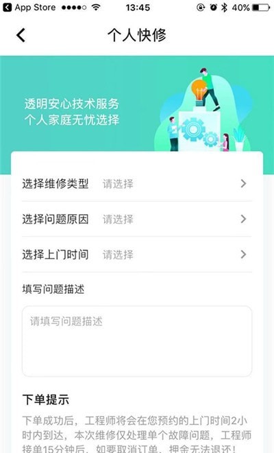 该软件界面友好,操作简便,用户只需简单几步即可完成服务请求的提交。用户在APP中选择所需的维修服务类型,如空调维修、洗衣机维修、管道疏通等;填写具体的维修需求和预约时间;提交服务请求,系统即会自动为用户匹配最优质的服务人员。服务完成后,用户可以直接在APP中进行支付,并对服务质量进行评价。