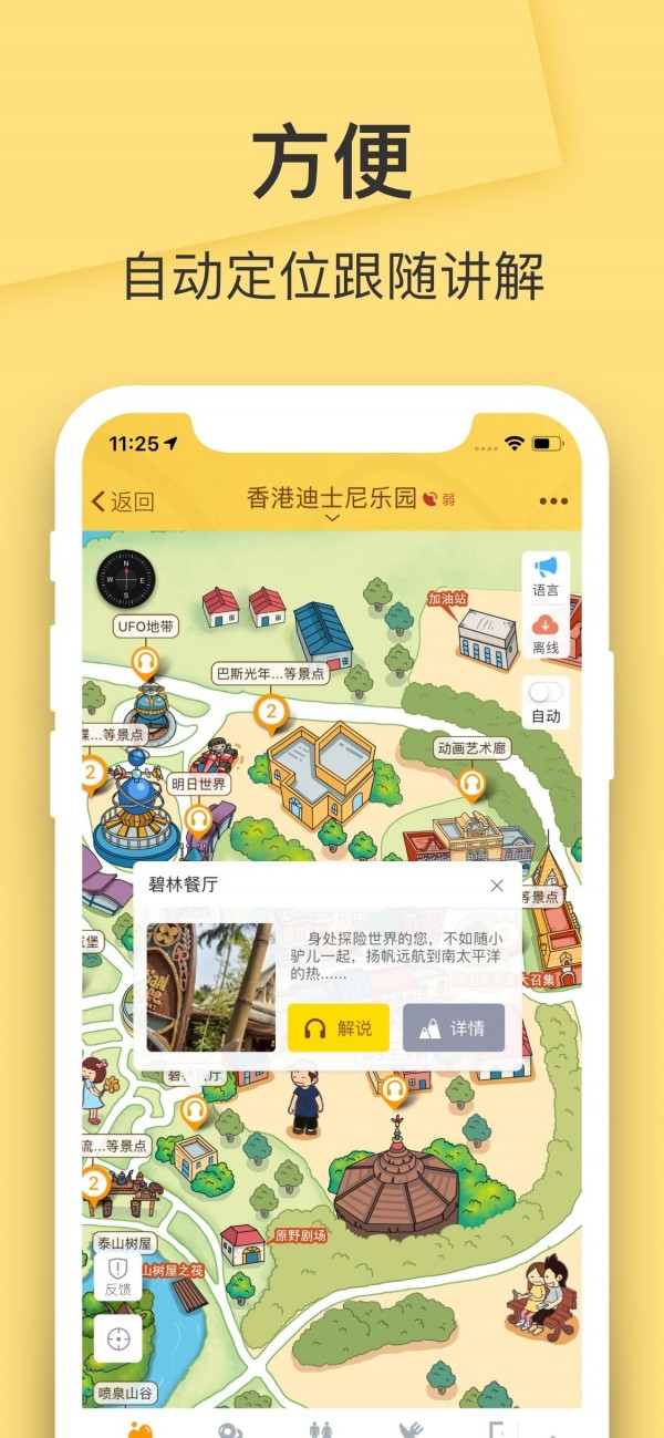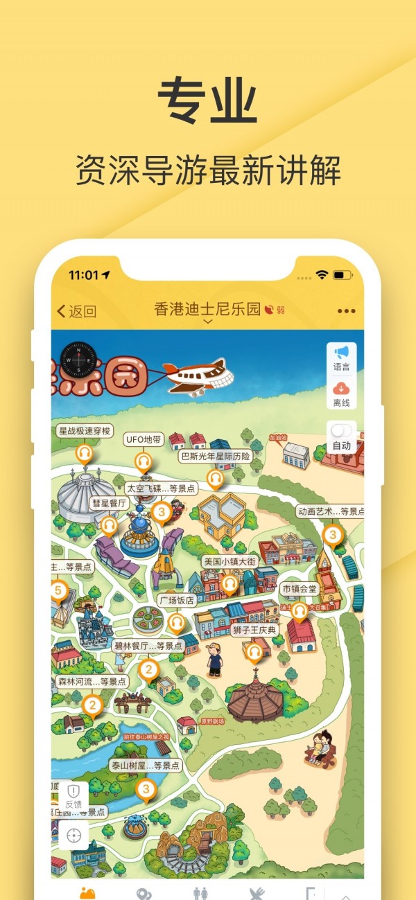 1.实时地图导航:迪士尼乐园App提供精确的乐园地图和实时导航服务。不仅显示了每一个游乐设施、餐厅、洗手间的位置,还能实时指引游客前往目的地的最佳路径。