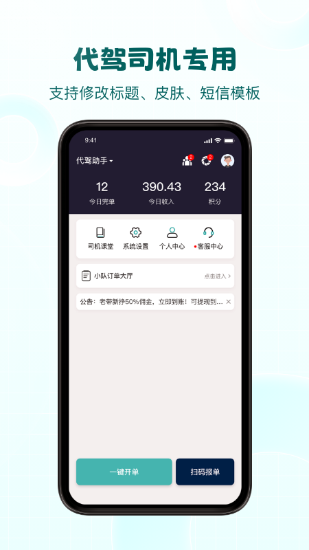 这款应用的核心功能覆盖了代驾服务的全流程:从一键创建订单、实时里程记录到自动生成费用账单。用户可以通过电子工牌展示二维码让客户扫码开单,系统会语音播报订单状态变化。针对地下室或恶劣天气导致的定位偏差,独有的里程纠偏功能可手动修正数据。动态加价模块支持1.1-2.0倍费率调节,适应夜间或特殊时段服务需求。应用还提供青绿、蓝、橙三种主题皮肤切换,以及自定义短信签名等个性化设置,让代驾服务更显专业。