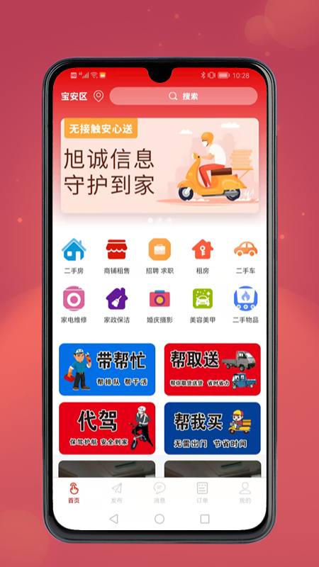 它主要是一个本地化信息发布平台,帮你解决生活中的各种需求。无论是想找跑腿代购、货运服务,还是需要维修家电、租房买房,这里都能满足你。你可以发布任务订单,其他人看到后就能接单帮忙,完成后还能领取佣金。平台涵盖了家政、货运、代驾等多种服务类型,功能非常全面。登录方式也很简单,用微信号或手机号就能快速注册使用。每天都有大量新信息更新,刷一刷就能发现有用的内容。