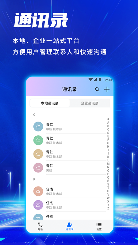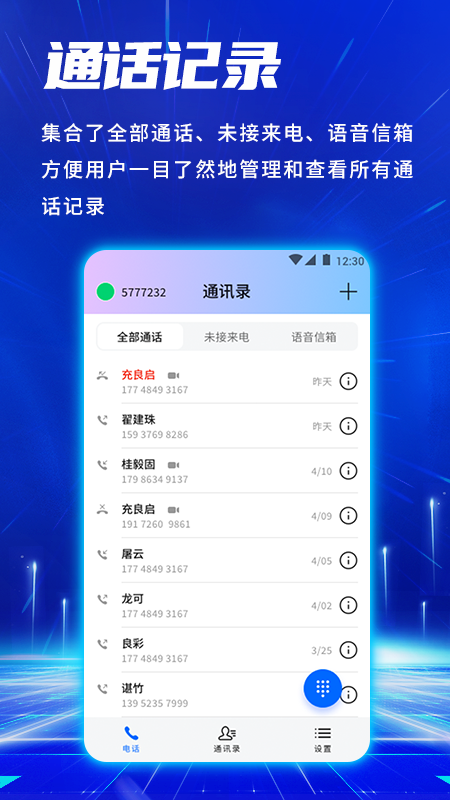 这款专业的电话通讯软件拥有便捷的联系人管理工具,让用户对所有的联系人进行分类管理,方便快速查找并及时联系对方进行高效沟通。它运用线上通讯方式提高双方的通讯效率,让沟通更加便捷,同时也支持各种个性化设置功能,为用户带来全新的通话体验。在通话过程中,它能提供更好的音质以及个性化的来电显示,让每一次通话都更加清晰和舒适。它还支持多种通话模式,包括来电显示、通话保持、呼叫转移、免打扰、多方会议等,甚至支持最多五方同时在线通话,满足团队协作的需求。