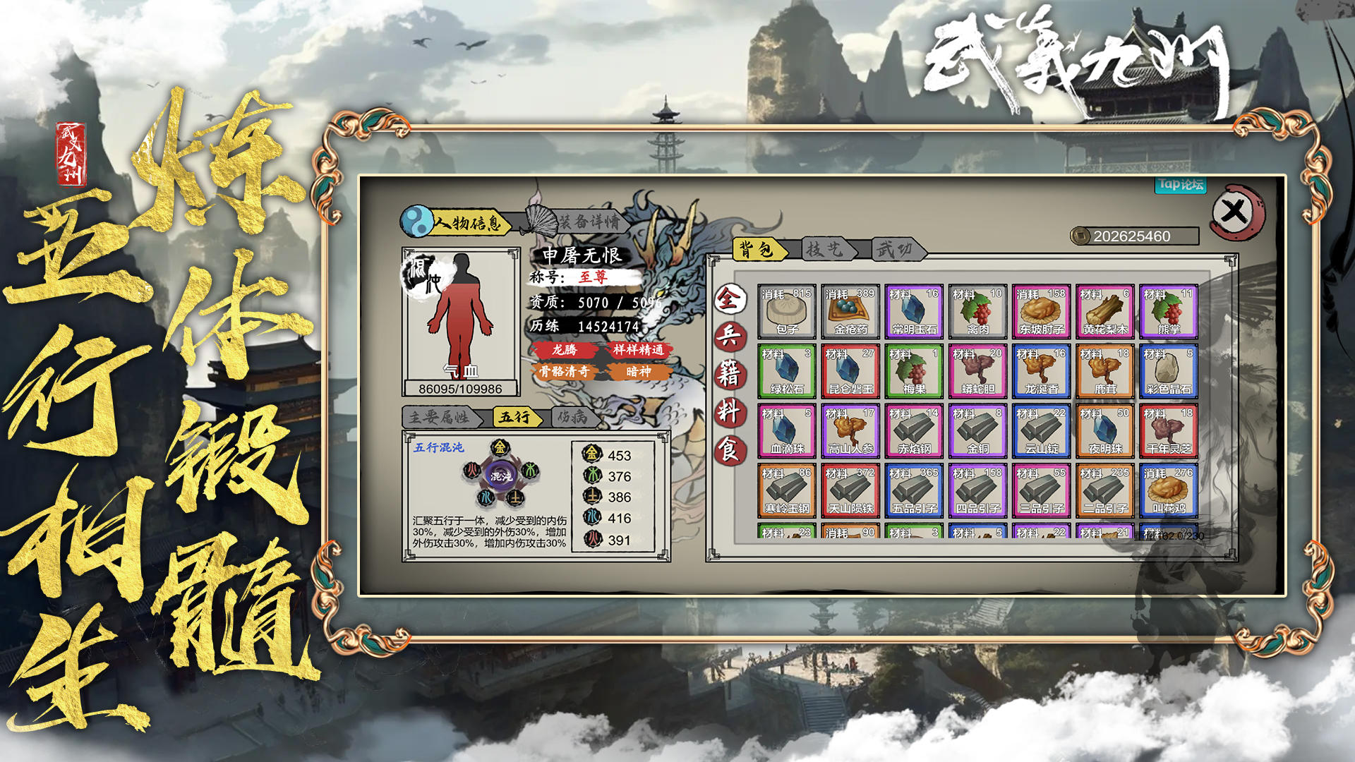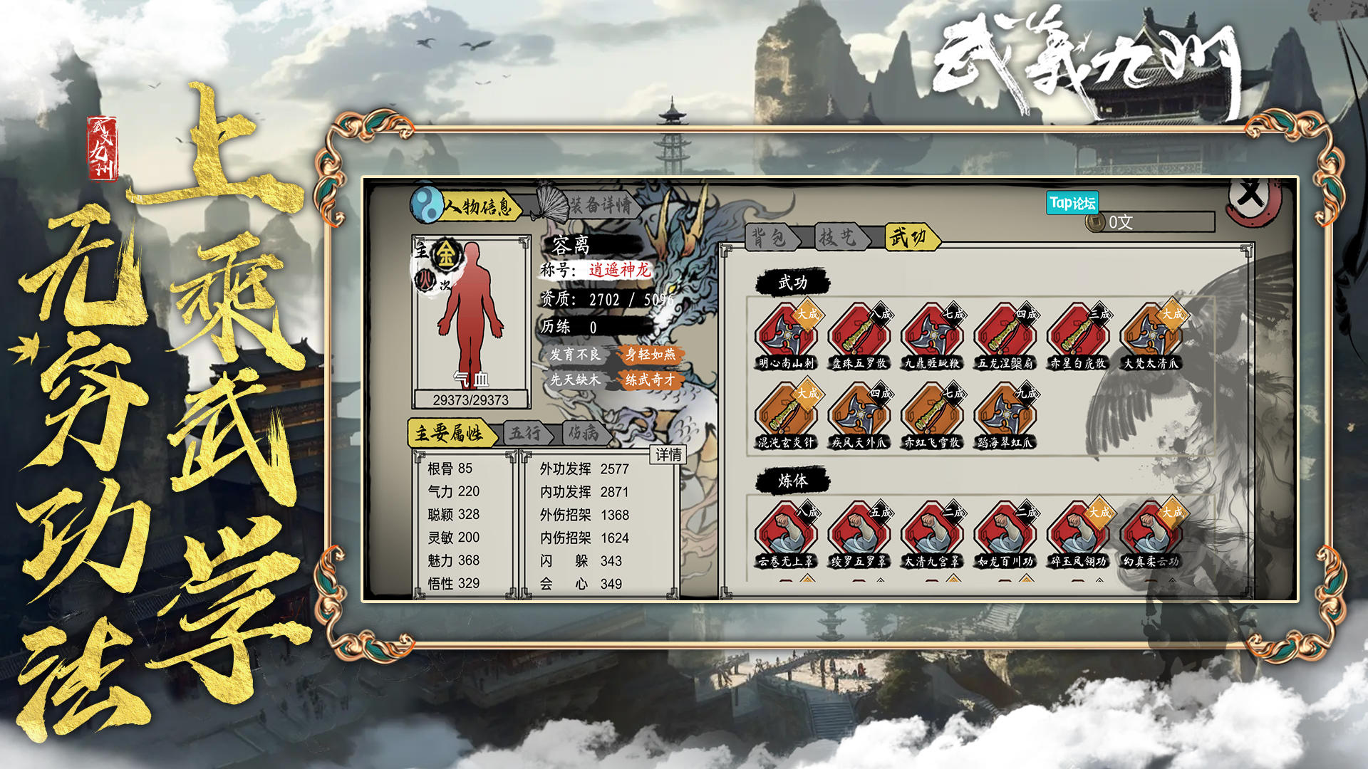 在这个武侠世界里,你将从无名小卒开始闯荡江湖。游戏地图完全随机生成,包含采集经营、丹药炼制、武艺切磋、功法修行等多种玩法。地上能开花的,树上能结果的,山里跑的水里游的,但凡能拿走的都可以收集起来,用来打造神兵利器或炼制灵丹妙药。游戏最核心的玩法是功法系统,上千种功法秘籍各具特色,还能通过五行相生相克产生特殊效果。不过要小心走火入魔哦!每月各城都会举办比武大会,江湖人物也会随时间变迁,让你感受到一个真实生动的武侠世界。