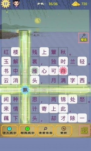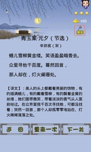 游戏中,玩家需要通过完成各种拼图和解谜任务来解锁新的古诗词。每完成一首诗或词,玩家不仅能学习到诗词的内容,更能了解其背后的历史文化背景、作者生平、作品赏析等。游戏覆盖了从先秦到清末各个时期的代表性诗词,内容丰富,涵盖广泛。