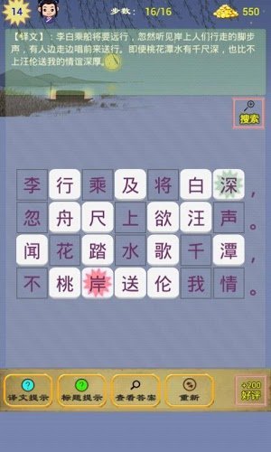 2.无论你是古诗词爱好者,还是寻求新奇游戏体验的玩家,古诗词拼拼乐都能给你带来不一样的乐趣。它不仅能帮助你掌握丰富的古诗词知识,更能让你感受到中国古代文学的魅力和深邃。在这个快节奏的时代,让我们一起慢下来,通过古诗词拼拼乐重新发现那些被遗忘的美好。