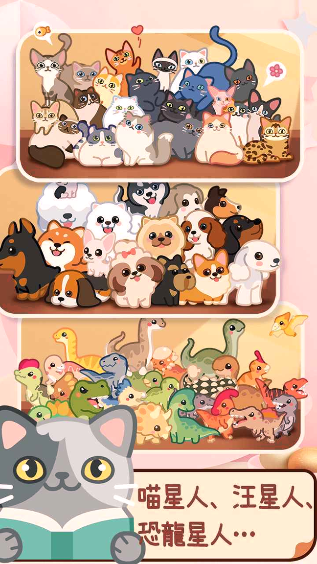 亲爱的朋友们,今天要给大家安利一款超治愈的休闲小游戏!这是一款以萌宠为主题的合成类手游,咱们可以通过简单的放置合成玩法解锁各种可爱的喵星人、汪星人甚至小恐龙。画风是那种让人一看就心情愉悦的卡通风格,音效也特别轻快,玩起来完全不会有压力。最棒的是它不需要咱们一直盯着屏幕,挂机也能获得资源和奖励,特别适合在通勤路上或者工作间隙放松一下呢!
