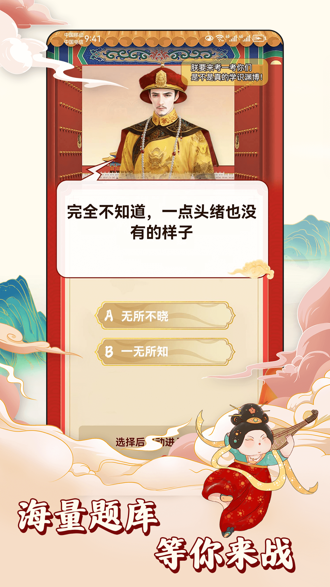 在玩家扮演一位怀揣抱负的书生,通过答题积累声望和经验值,实现从九品芝麻官到一品大员的逆袭。每道题目都是一次晋升机会,答对可获积分奖励,答错可能降级,考验玩家的知识储备与策略选择。随着官职提升,关卡难度逐渐增加,还会解锁新剧情、任务和社交玩法,比如与好友PK或参与全球排行榜竞争。游戏界面设计古风雅致,角色造型生动,搭配轻快的背景音乐,营造出沉浸式的古代官场氛围。